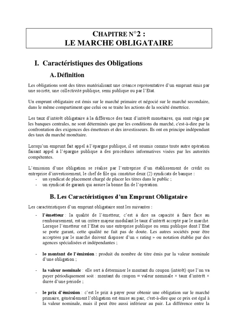 Caractéristiques des obligations & terminologie | Finance ... from financedemarche.fr Une obligation (bond en anglais) est un titre financier qui matérialise une dette qu'un etat (sovereign bond), une collectivité (muni bond) ou une entreprise au même titre que les actions, certaines obligations sont cotées, et s'échangent sur les marchés financiers. Une obligation est une valeur mobilière qui constitue une créance sur son émetteur, elle est donc représentative d'une dette financière à moyen, long terme, parfois même à perpétuité. Une obligation est une valeur mobilière qui constitue une créance sur son émetteur, elle est donc représentative d'une dette financière à moyen, long terme, parfois même à perpétuité. Obligations comment ça marche ? Prix et risque des obligations (doc 2/4) quelques remarques sur les coupons la mesure du risque de taux contenu du document ce document aborde. S'utilise avec les articles la, l' (devant une voyelle ou un h muet), une. ,,obligation dont l'inexécution n'est pas juridiquement sanctionnée et qui, par conséquent, ne contraint qu'en conscience`` (jur. Plus rare a home is usually the largest purchase made in a lifetime, and the related mortgage is.